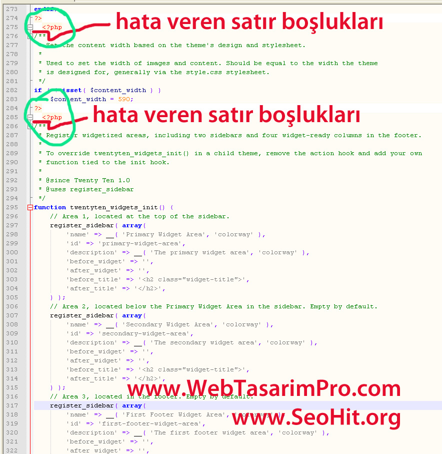 CMS sitelerde sıklıkla karşılaşılan bu hata bazen web sitenizde ister WordPress olsun, İster Drupal yada Joomla web sitenizin kaynak kodlarında uygun olmayan bir html editörü ile yapmış olduğunuz modifikasyonlardan meydana gelmektedir. Ve bu hatayı düzeltmek aslında çok basit öncelikle ücretsiz olarak dağıtılmakta olan ” notepad++ ” sı adresinden http://notepad-plus-plus.org/ html editörü olarak indirin. ve aşağıda örnekte görülen artık sizin hata mesajınız yüklediğiniz temadan kaynaklanabilir farklı uyarı yazıları alacaksınız. Bu yazılardaki ilk php dosyasının yolu ve adını bulun Ftp ile bağlanarak masa üstüne indirim ve notepad++ ile açarak o hata satırına gidin ve aşağıda tarif ettiğim ve fotoğrafta gördüğünüz gibi düzeltin.